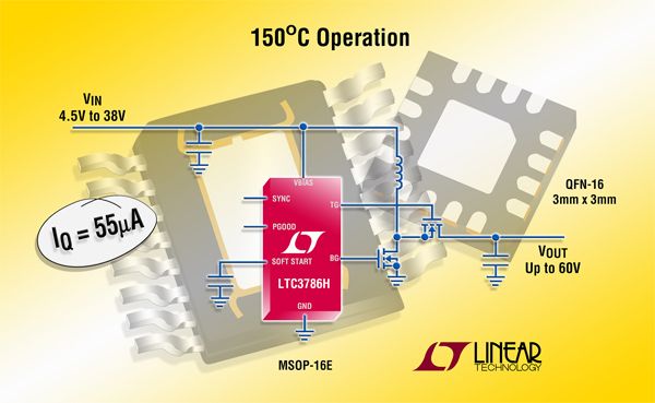 Linear Technology Corporation announces the H-grade versions of the LTC3786, a synchronous step-up DC/DC controller with guaranteed operation for junction temperatures up to 150°C. The LTC3786 replaces the boost diode with an N-channel MOSFET for higher efficiency and reduced power loss. This controller can produce 24V at 5A output from a 12V input with up to 98% efficiency, ideal for automotive, industrial, and medical applications.