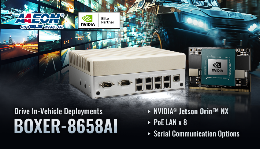 AAEON today announced a new addition to its extensive range of embedded AI systems based on the NVIDIA Jetson Orin NX, the BOXER-8658AI. Designed for the in-vehicle market, the BOXER-8658AI stands out with eight PoE LAN ports (802.3af/at), as well as GNSS, a 9-axis sensor, E-Mark certification, and 9V to 36V input with accessory ignition delay on/off.