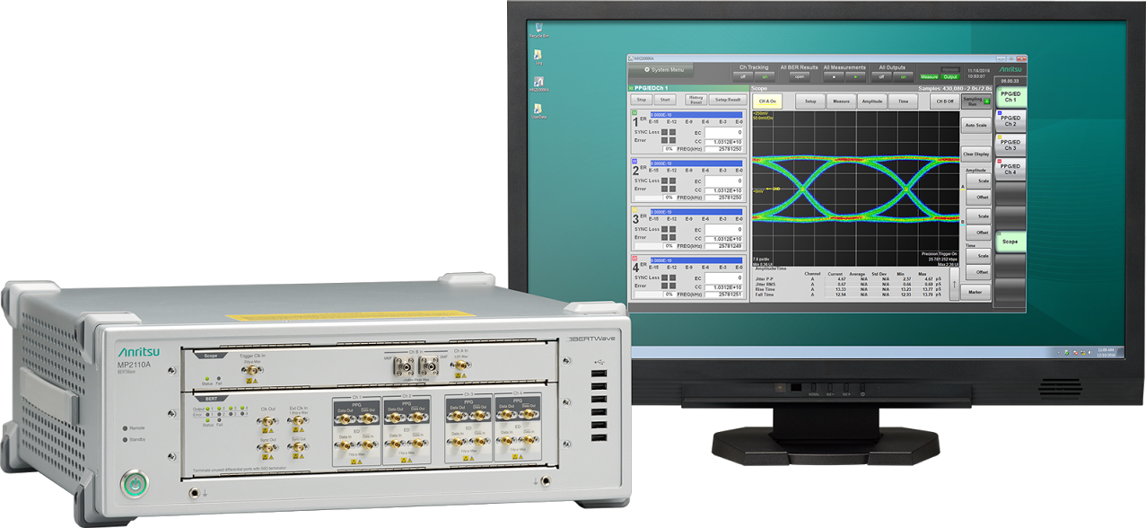 To meet these needs, Anritsu is releasing its all-in-one BERTWave MP2110A with built-in BERT for up to 4ch, and sampling oscilloscope up to 2ch for efficient evaluations of multi-channel optical modules used by 100 GbE standards, such as QSFP28, and other standards, such as InfiniBand EDR, 32G Fibre Channel, etc.