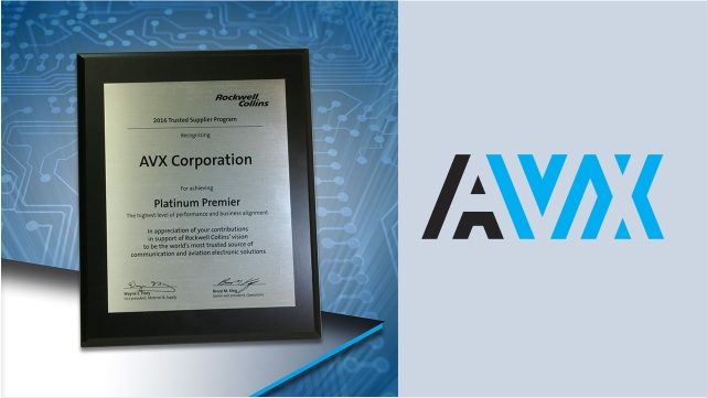 AVX Corporation, a leading manufacturer and supplier of passive components and interconnect solutions, has received a prestigious 2016 Rockwell Collins Platinum Premier Award, which honors top-performing suppliers for having maintained the highest levels of quality, delivery, and business alignment over the full course of the year, and is the highest recognition a company can achieve through Rockwell Collins’ Trusted Supplier Program.