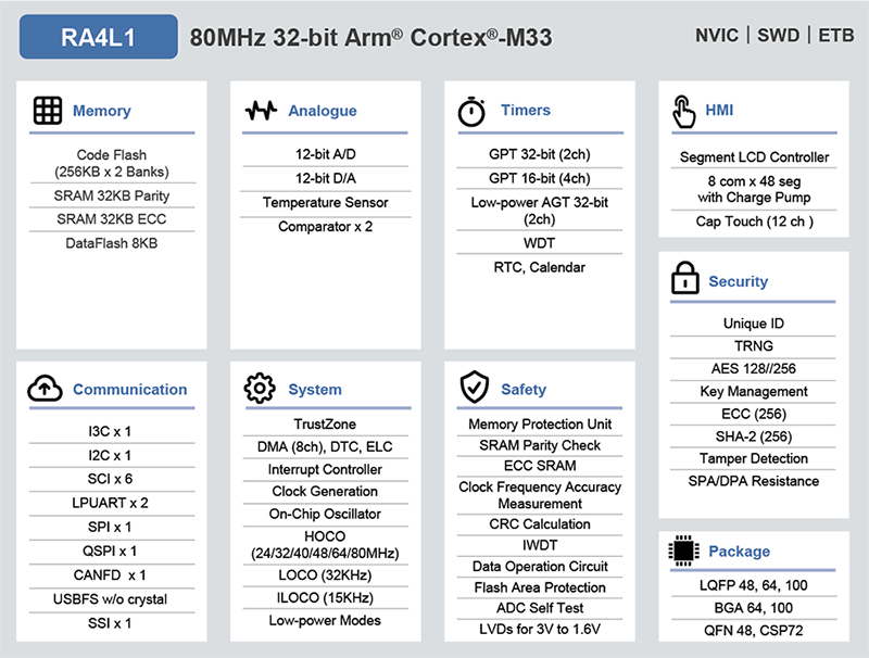 The RA4L1 supports a wide range of peripheral features that have been optimized for low-power applications with a wide range of communication interfaces, along with a wealth of analog and system features.