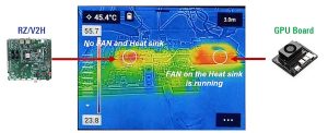 Figure 1 illustrates the heat generated by the RZ/V2H and a GPU board when the same AI process is executed, as captured by an infrared camera. Unlike GPUs, which typically require cooling fans due to their high power consumption, RZ/V2H maintains a similar temperature without the need for any cooling mechanisms.