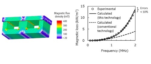 With this technology, it has become possible to accurately compute the distribution of eddy currents(1) that flow through an inductor by formularizing the dielectric effects of ferrite microstructures, which are the main magnetic materials used as inductor materials. This makes it possible to accurately compute the size of eddy current loss, which is the primary cause of ferrite magnetic loss. Accordingly, while it was difficult for previous estimation methods to estimate the size of the eddy current loss when the inductor’s operating frequency exceeded a few dozen kilohertz, the new technology has enabled the estimation error for magnetic to be below 10% across a broad range of operating frequencies, up to several megahertz.