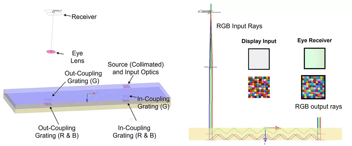 For HVG gratings, a simple full color test bench is set up in LightTools, as shown in Figure 13. HVG AR glasses simulations also demonstrate significant improvements after optimization.