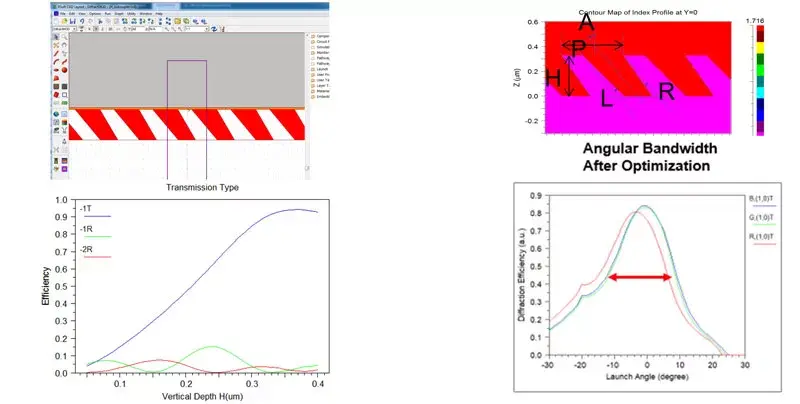 - Surface relief gratings (SRG): Surface relief gratings are commonly used for AR glasses. SRG are tapered, slanted grooves etched on a substrate, which can give high first-order transmission at certain vertical depths. After optimization, we can find the best field of view (FOV) of grating dimension configurations for RGB light.