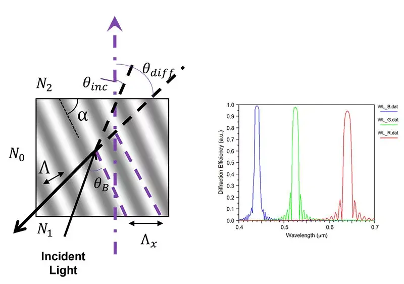 - Holographic volume gratings (HVG): Created using holographic recording methods, these gratings record interference patterns with two beams. They offer moderate index modulation and limited FOV.
