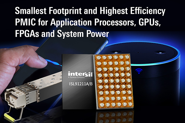 Intersil, a subsidiary of Renesas Electronics Corporation, on May 15, introduced a highly integrated programmable power management IC (PMIC) that delivers 91% efficiency at 1.1V output voltage for application processors, GPUs, FPGAs and high-performance system power. The new PMIC’s low RDS(on) MOSFETs and programmable PWM frequency allows designers to use fewer low-profile external components, enabling a 50mm2 power-supply that is 40% smaller than competing solutions. The ISL91211 triple/quad output PMIC is ideal for smartphones, tablet computers, solid-state drives, networking and wireless Internet of Things (IoT) devices powered by single-cell Lithium-ion (Li-on) batteries, or 2.5V – 5.5V power supplies.