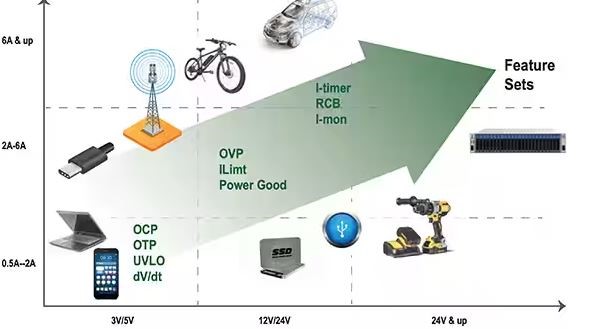 Figure 1: eFuse feature sets are strongly correlated with the input voltage (horizontal axis) and input current (vertical axis) of the application. (Image source: Littelfuse)