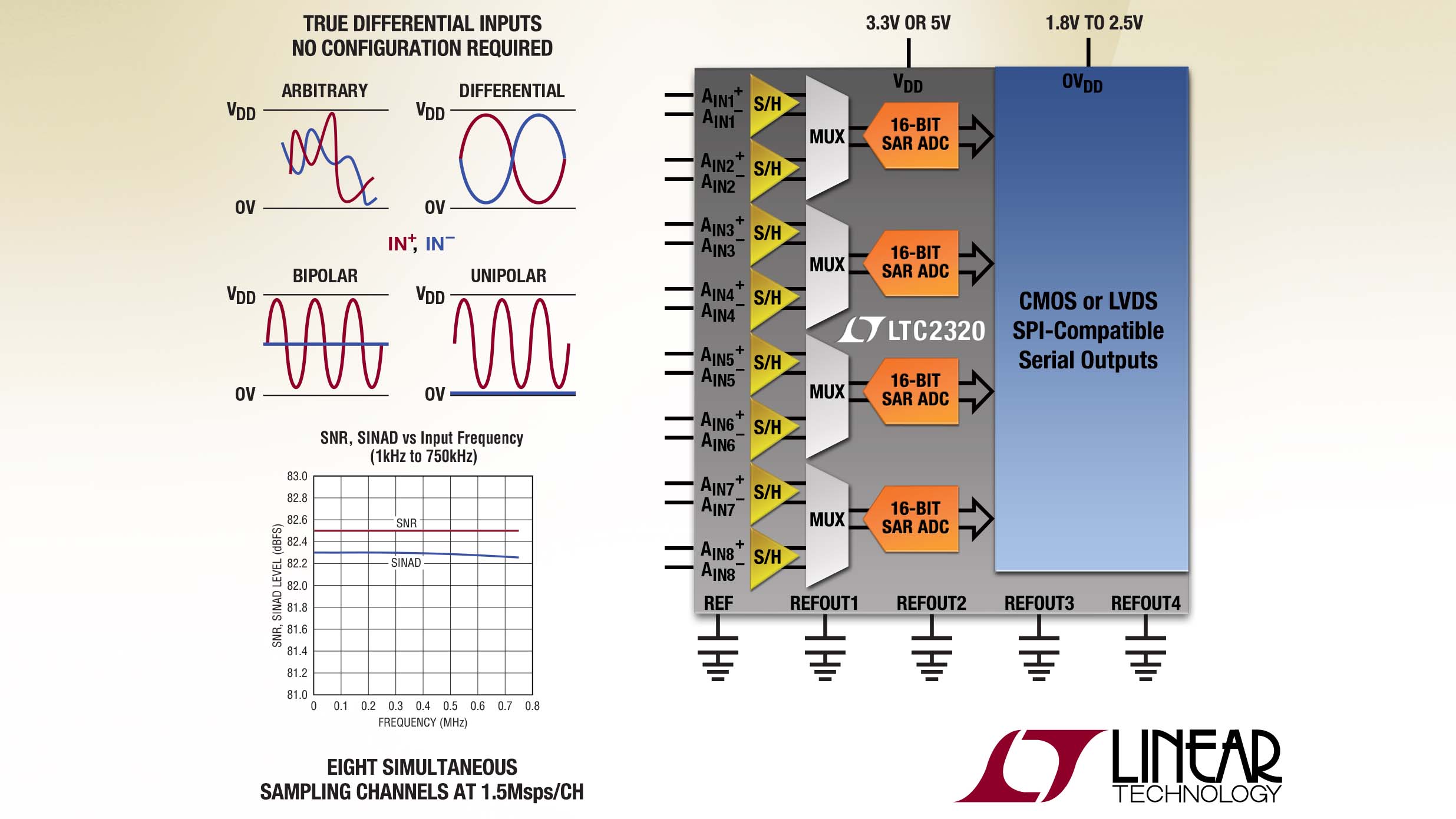 Linear Technology Corporation introduces the LTC2320-16, a 16-bit 1.5Msps per channel, no latency successive approximation register (SAR) ADC with eight simultaneously sampling channels supporting a rail-to-rail input common mode range. The LTC2320-16 features a flexible analog front end that accepts fully differential, unipolar or bipolar analog input signals, as well as arbitrary input signals, and maintains an 82dB signal-to-noise ratio (SNR) and high common mode rejection ratio (CMRR) of 102dB, when sampling input signals up to the Nyquist frequency. This wide input bandwidth of the LTC2320 allows the digitization of input signals up to the Nyquist frequency of 750kHz.