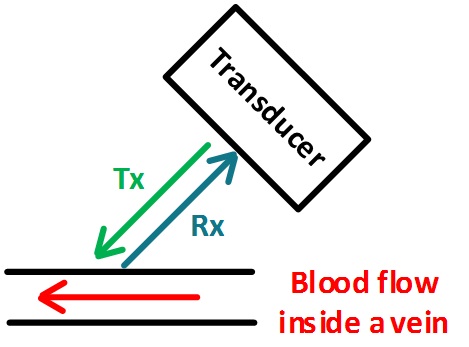In CW Doppler, half of the transducer array (transmitter/receiver array) continuously transmits a high-frequency audio sine wave, denoted by Tx in Fig. 1. A portion of this signal is reflected by the blood cells flowing within a targeted vein. This reflected signal is received by the second half of the transducer, denoted by Rx.