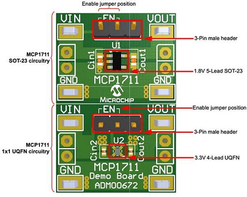 To explore the operation of the MCP1711 over a wide input voltage and load range, designers can use the ADM00672 demo board that includes two voltage options and two package options: