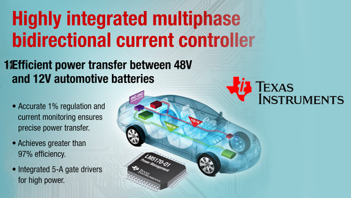 Texas Instruments introduced the industry’s first fully integrated multiphase bidirectional DC/DC current controller, which efficiently transfers electric power greater than 500 W per phase between dual 48-V and 12-V automotive battery systems. The highly integrated LM5170-Q1 analog controller features an innovative average current-mode control method that overcomes the challenges of today’s high-component-count, full digital control schemes. For more information, samples and an evaluation module, see www.ti.com/lm5170q1-pr.