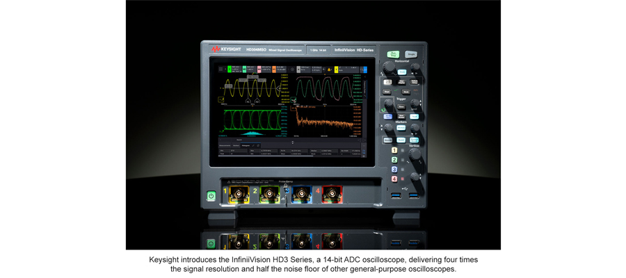 Keysight Technologies, Inc. introduces the InfiniiVision HD3 Series, a 14-bit analog-to-digital converter (ADC) oscilloscope, delivering four times the signal resolution and half the noise floor of other general-purpose oscilloscopes. Newly designed and built from the ground up with a custom application-specific integrated circuit (ASIC) and deep memory architecture, the HD3 Series enables engineers to quickly detect and fix signal issues in a variety of applications.