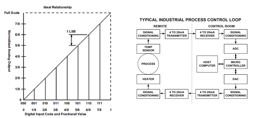 Data converters are classified as either analogue to digital (ADC) or digital to analogue (DAC). A simple, functional block diagram of an industrial process closed loop controller featuring an ADC and a DAC is shown in Figure 1. Note that the input and output of the ADC and DAC are supported by signal conditioning functions. Signal conditioning may involve using low pass filters on the ADC input, for example, to remove any high-frequency signal artefacts that might interfere with the ADC’s conversion accuracy. Alternatively, signal conditioning may be applied to limit the input range of the acquired analogue signal to prevent damage to the ADC.