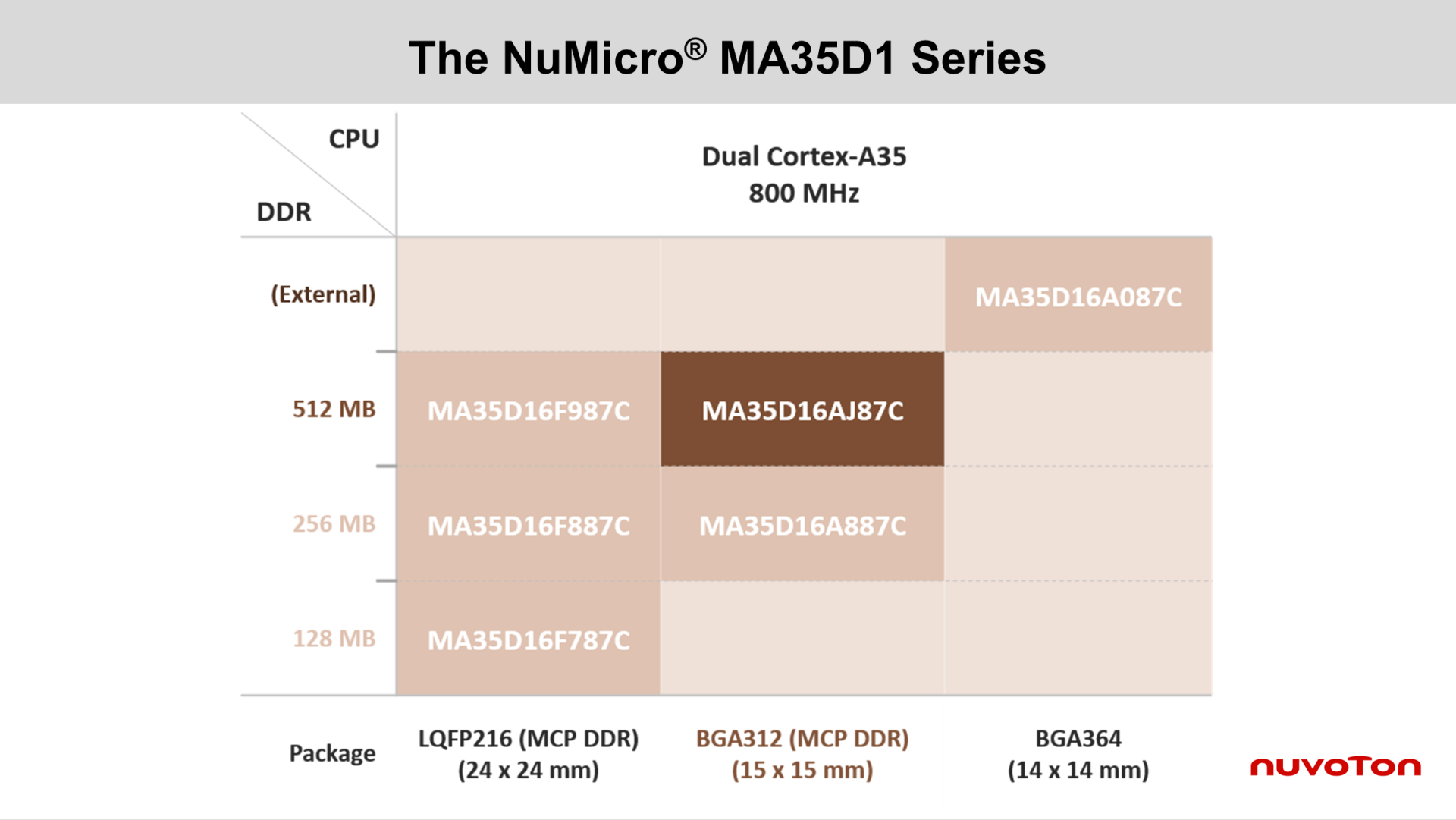 Nuvoton Technology announced the MA35D16AJ87C, a new member of the MA35 series microprocessors. Featuring an industry-leading 15 x 15 mm BGA312 package with 512 MB of DDR SDRAM stacked inside, the MA35D16AJ87C streamlines PCB design, reduces product footprint, and lowers EMI, making it an excellent fit for space-constrained industrial applications.