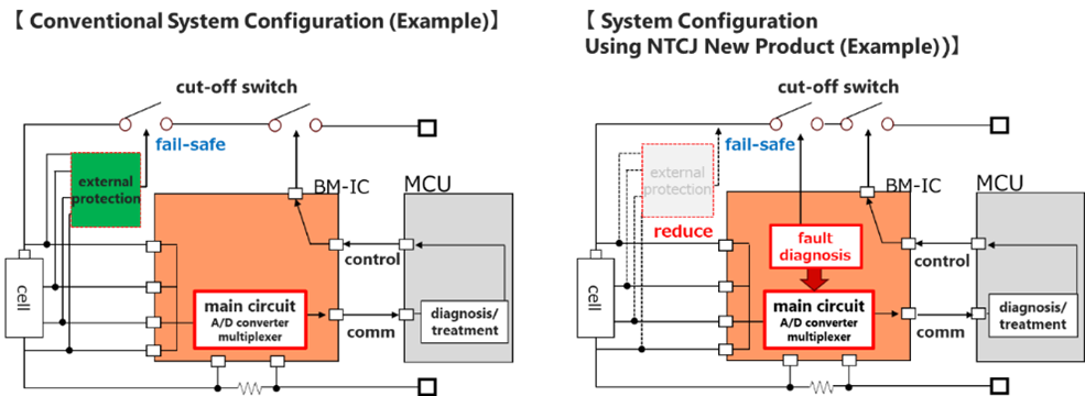 - By incorporating fault diagnosis and fail-safe functions within the battery monitoring IC(BM-IC), it is possible to build a safe system without external protection circuits. This contributes to improved safety of the Battery Management System (BMS) and reduced system costs.