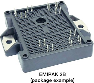 OBCs of up to 22 kW (400 VAC input, 500 VDC output) rely on semiconductor solutions in power modules due to their high power density. By using modules specifically designed for the charger, it is possible to achieve high system efficiency and at the same time high power density. The EMIPAK 2B package is proving to be a very robust and efficient solution in this field. This package has already established itself in a wide variety of applications and configurations. The internal structure of the power modules is specially adapted to the applications and the requirements of the automotive industry. As a result, the power modules can be adapted to each generation of charging systems, and the latest generation of semiconductors can be used in each case. The use of press-fit connections for the electrical contacts makes it very easy and quick to assemble the modules. The direct connection to the liquid cooling system in the vehicle enables a very high power density and optimizes the thermal management of the modules.