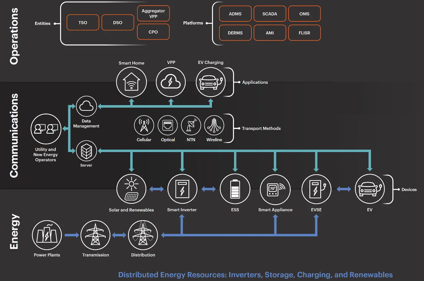 Grid modernization requires a strategic overhaul of legacy power infrastructure at the energy, communications, and operations levels, as illustrated in Figure 4. Existing energy infrastructure must be scalable and be able to incorporate and integrate renewable and distributed energy resources (DERs). Bi-directional communication protocols must continue to evolve to enable real-time data exchange between power-generating assets, energy storage systems, and end-user loads.
