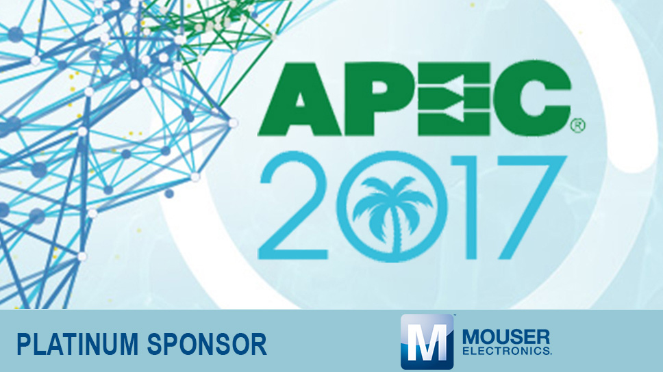 As an APEC Platinum Partner, Mouser will provide exciting and interactive information, including some of the newest product innovations from leading suppliers such as Analog Devices, Infineon, Maxim Integrated, Microchip Technology, Murata, Panasonic, ROHM Semiconductor, and Texas Instruments. Visitors to the Mouser Booth will also get the latest news from the Empowering Innovation Together program and have a chance to win a smartwatch.