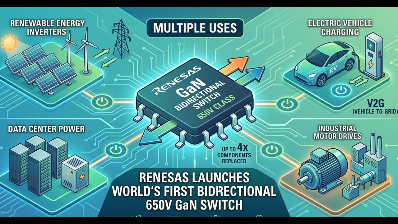 Renesas Electronics Corporation, a premier supplier of advanced semiconductor solutions, unveiled the industry’s first bidirectional switch using depletion-mode (d-mode) GaN technology, capable of blocking both positive and negative currents in a single device with integrated DC blocking. Targeting single-stage solar microinverters, AI data centres, and onboard electric-vehicle chargers, the high-voltage TP65B110HRU dramatically simplifies power-converter designs. It replaces conventional back-to-back FET switches with a single low-loss, fast-switching, easy-to-drive device.