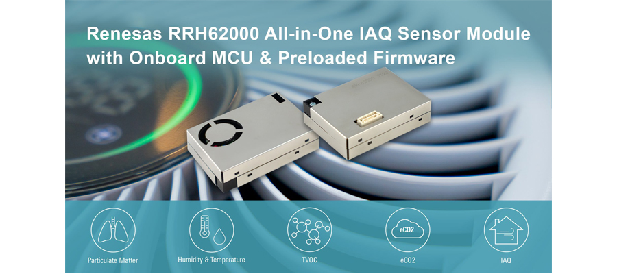 Renesas Electronics Corporation, a premier supplier of advanced semiconductor solutions, today introduced an advanced all-in-one sensor module designed for indoor air quality monitoring. The RRH62000, the first multi-sensor air quality module from Renesas, integrates multiple sensor parameters in a compact design and accurately detects different particle sizes, volatile organic compounds and gasses harmful to human health. With a Renesas microcontroller (MCU) on board, the module offers an intelligent sensor management solution for a growing market of air monitoring applications, including air purifiers, smoke detectors, HVAC systems, weather stations and smart home systems. Its robust firmware also enables customer products to comply with various air quality standards around the world.