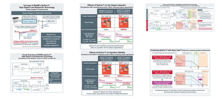 ROHM established QuiCur, a new power supply technology that improves the load transient response characteristics (response performance involving response speed, and voltage stability of subsequent stage) of DC/DC converter ICs (Switching regulators) and LDOs (Linear regulators).