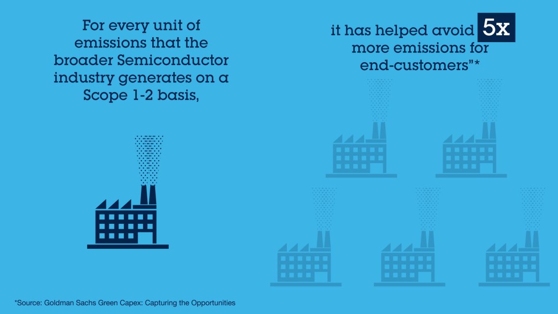 The role of semiconductors as a key enabler in accelerating society’s transition to greener and smarter systems is less well understood. As our economy switches from fossil fuels to more sustainable energy generation methods, maximizing energy efficiency, while preserving the environment, has become central for driving growth and economic productivity. Semiconductors are a key building block to achieving this. They improve the efficiency of end products and help achieve key sustainability goals. An independent report estimates that “for every unit of emissions that the broader semiconductor industry generates on a Scope 1-2 basis, it has helped avoid 5x more emissions for end-customers.”