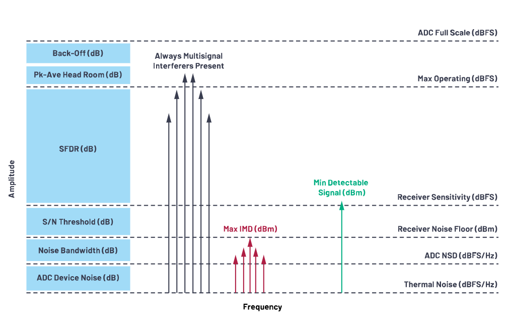 Figure 1. Relating SFDR to ADC operating range, noise, IMD spurs, and detection threshold.