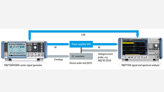 The R&S SMW200A vector signal generator combined with the R&S FSW signal and spectrum analyzer offers fast and simple power amplifier testing including envelope tracking and digital predistortion, effectively replacing complex test setups.