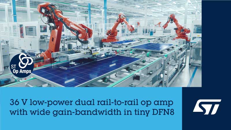 STMicroelectronics has introduced the TSB952 dual operational amplifier (op amp) with 52MHz gain bandwidth and supply current of just 3.3mA per channel at 36V, delivering high performance for power-conscious designs.