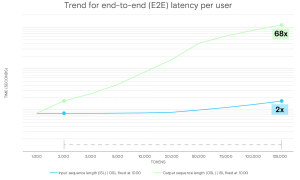 The chart below shows the impact of increasing input sequence length (ISL) and output sequence length (OSL) on the entire end-to-end latency. Each measurement was taken with a batch size of 1 (i.e., a single request).
