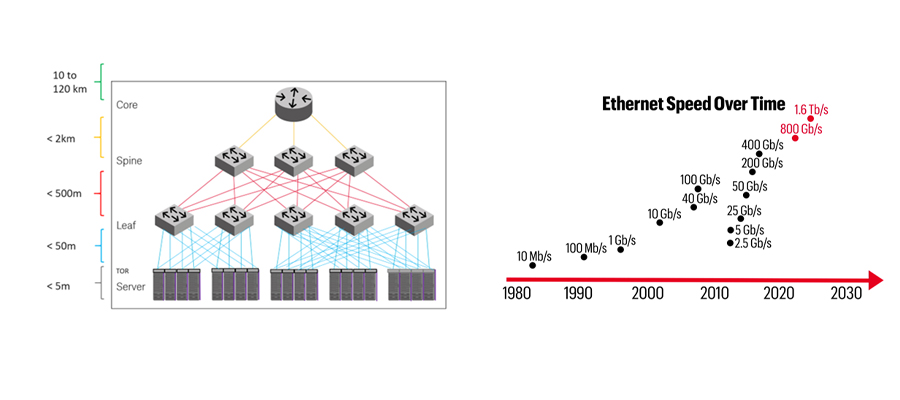 To understand 1.6T research and development, one first needs to understand data centers. Data centers are organized around a core router, fed by a network of switches that provide connections between each row and rack of servers. Each server rack features a top-of-rack (TOR) switch that routes data and delegates processes to specific servers. Copper or fiber optic cables connect the backplane of each server with optical modules that perform the electro-optic conversion.