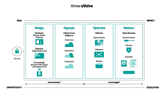 As the only global technology company capable of providing comprehensive, sensor-to-sunset full IoT product lifecycle solutions, Arrow is uniquely positioned to guide the biggest names in technology, and startups and makers alike, along their IoT production journey. For many years, Arrow has been supplying many of the key components of an IoT infrastructure, including sensors, low-power microcontrollers, wireless connectivity systems, network protocols, gateways, operating systems, security solutions, big data platform management systems, cloud solutions, and tools for device management and data analysis.