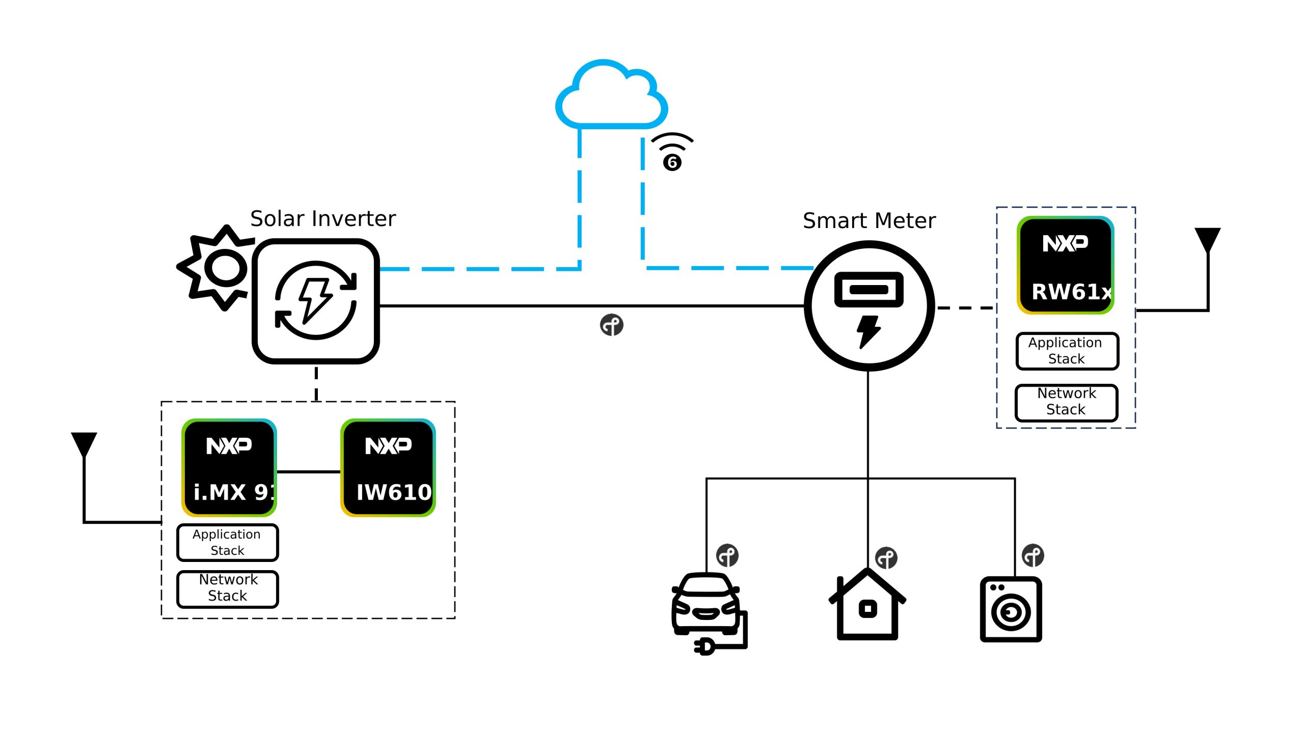 NXP provides a solution for smart energy management systems. The IoT-optimized IW610 Wi-Fi 6 Tri-radio solution can be paired with the i.MX 91 Processor in Radio-Co-Processor (RCP) mode to implement wireless connectivity in smart meter, solar inverter, or other smart energy applications. With diverse host interface support for SDIO, USB, UAR,T and SPI, the IW610 can be paired with a wide range of NXP processors or third-party, non-NXP processors. Additionally, the connectivity solution is scalable by pairing the i.MX 91 with the IW612 Wi-Fi 6 Tri-Radio solution or IW416 Wi-Fi 4 + Bluetooth solution for applications that require higher or lower wireless performance, respectively. For applications that require less processing performance, the RW61x can be used as a single-chip solution for MCU and connectivity.
