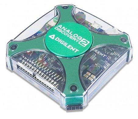 Digilent Analog Discovery 2 (134-6480) is a USB oscilloscope, logic analyzer, and multi-function instrument that allows users to measure, visualize, generate, record, and control mixed-signal circuits of all kinds. Driven by the free WaveForms software, Analog Discovery 2 can be configured to work as any one of several traditional test and measurement instruments including an Oscilloscope, Waveform Generator, Power Supply, Voltmeter, Data Logger, Logic Analyzer, Pattern Generator, Static I/O, Spectrum Analyzer, Network Analyzer, Impedance Analyzer, and Protocol Analyzer.