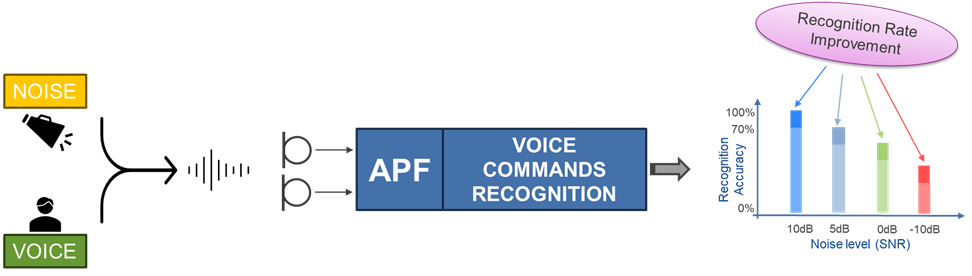 The Audio Pre-processing Front-end (APF) is an ultra-lightweight library of voice processing algorithms designed to enhance Voice Command Recognition (VCR) and speech quality in noisy environments. It utilizes acoustic noise suppression, which offers several benefits in voice command recognition, particularly in locations where significant levels of ambient noise typically interfere with VCR. Here are some key advantages: